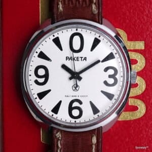 Raketa (in russo significa “razzo”) è uno dei marchi sovietici più adatti ai neofiti. Fondata a San Pietroburgo, ha prodotto orologi dal 1961 con enorme varietà di modelli. Le caratteristiche principali dei Raketa includono movimenti meccanici semplici ma affidabili (spesso a carica manuale) e design molto diversi tra loro – dal classico stile elegante ai modelli con quadrante a 24 ore pensati per l’uso nelle regioni polari. Un esempio famoso è il Raketa “Big Zero”, così chiamato per lo 0 gigante al posto del 12 sul quadrante: un orologio dal look minimalista ma iconico, simbolo del design sovietico anni ‘70. I prezzi dei Raketa vintage sono generalmente contenuti: un modello di base in buone condizioni si può trovare indicativamente tra 50€ e 100€. Questo li rende perfetti per iniziare, perché con una spesa ridotta si ottiene un pezzo storico funzionante. Il punto di forza dei Raketa sta nella varietà: puoi divertirti a cercare diverse varianti (dai modelli da uomo più sobri a quelli più eccentrici) restando in una fascia di prezzo entry-level.